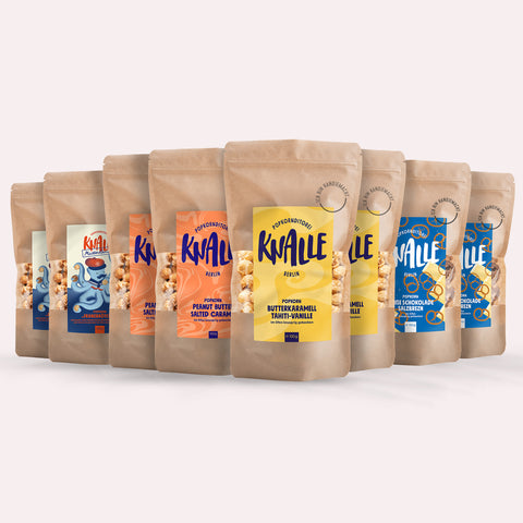Bei Knalle musst Du Dich nicht entscheiden. Unser limitiertes Süß & Salzig Set vereint das Beste aus beiden Welten: acht handgefertigte Popkornkreationen aus unserer Berliner Manufaktur, frisch gebacken und mit allerfeinsten Zutaten veredelt. Ob cremiges Butterkaramell mit Tahiti-Vanille, süß-salzige weiße Schokolade mit zimtzuckrigen Laugenbrezn, das an Hamburger Franzbrötchen erinnernde Popkorn mit Twist oder die intensive Kombination aus Peanut Butter und Salted Caramel: jede Knuspertüte ist ein kleiner Ausflug in unsere Aromenwelt. Das Set ist ideal für alle, die Abwechslung lieben und besondere Genussmomente feiern wollen. Ob zum Teilen, Verschenken oder ganz für Dich allein: Dieses Popkorn Set bringt süße und salzig-süße Sorten in perfekter Balance auf den Tisch.